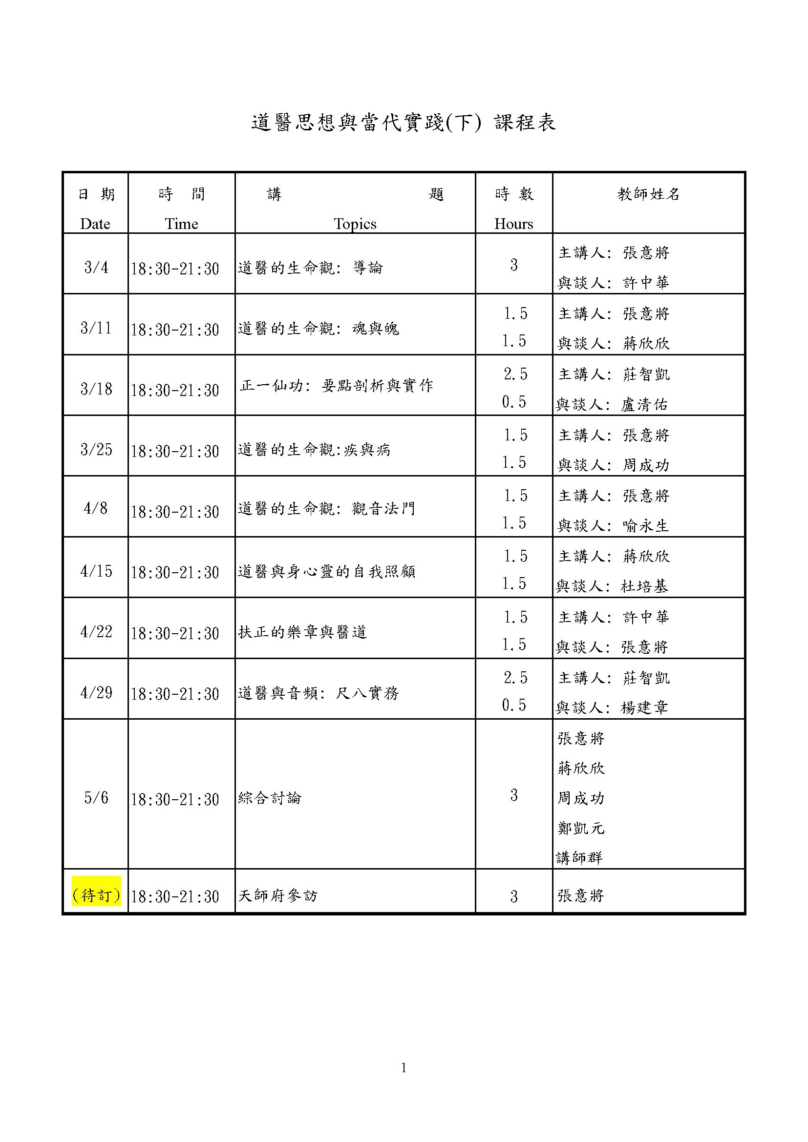 【道醫思想與當代實踐 課程表】